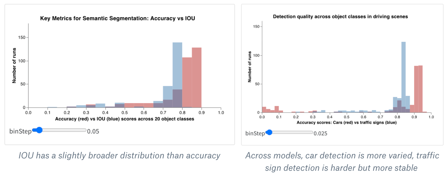 히스토그램은 숫자 분포를 시각화하여 더 큰 데이터셋을 이해하는 데 도움을 줄 수 있습니다. 합성 히스토그램은 동일한 bin에서 여러 분포를 보여주어 서로 다른 모델 간 또는 모델 내의 서로 다른 클래스 간에 두 개 이상의 메트릭을 비교할 수 있습니다. 운전 장면에서 오브젝트를 감지하는 시멘틱 세그멘테이션 모델의 경우 정확도 대 IOU (intersection over union)에 대해 최적화하는 효과를 비교하거나 서로 다른 모델이 자동차 (데이터에서 크고 일반적인 영역) 대 교통 표지판 (훨씬 작고 덜 일반적인 영역)을 얼마나 잘 감지하는지 알고 싶을 수 있습니다. 데모 Colab에서는 10가지 생물 클래스 중 2가지에 대한 신뢰도 점수를 비교할 수 있습니다.